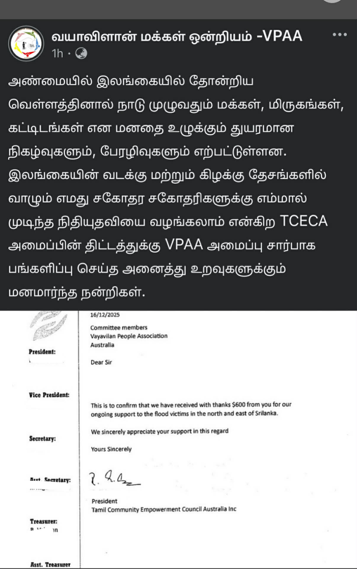 2018 ஆண்டில், இரணைமடு குளம் உடைத்தபோது வெள்ளத்தால் பாதிக்கப்பட்ட கிளிநொச்சி மக்களுக்கு சேர்ந்த பணத்தில் 25% வீதத்தை ($250) டொலரை, பாதிக்கப்பட்ட அவ்வூர் மக்களுக்கு எமது ஊரின் பெயரில் செய்யலாம் என்று அவுஸ்ரேலியாவில் உள்ள பல வயவர்கள் கேட்டபோது தானாமே, மாமா மச்சான் அண்ணன் தம்பி எல்லாம் எதிராக (vote வோட்) போட்டு, குண்டா சட்டியில் குதிரையை ஓட்டி, அப்படி செய்யமுடியாது என்றும் சொல்லும் போது தானாம், தலைவராக இருந்தவரும அவரை சுற்றி இருந்த ஒன்பது ஊரவர்கள் அமைப்பே வேண்டாம் என்ற விட்டு சென்று, இப்போது Helping hand association Australia( உதவும் கரங்கள் அமைப்பு அவுஸ்ரேலியா) என்ற பெயருடன் 2018 ஆரம்பித்து,192 திட்டங்களுக்கு மேல் செய்து வெற்றிப்பாதையில் பயனிக்கிறார்கள் என்று அவுஸ்ரேலியர்கள் ஊடாக அறிய முடிகின்றது. ஏண்டா இப்ப செய்கிறதை, அப்பவே அவற்றை அவங்களுடன் சேர்ந்து செய்திருக்கலாம் தானே பிரிவு இல்லாமல்?